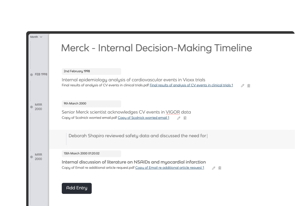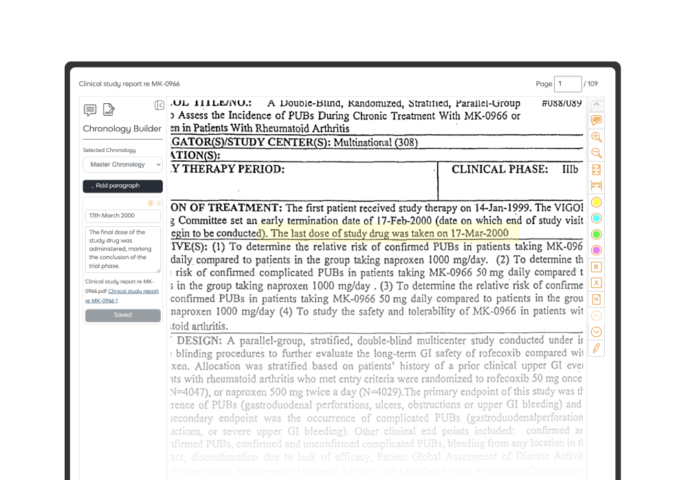 Extract events from clinical notes, correspondence, and reports as you review, and build cross-referenced, fully editable case timelines.